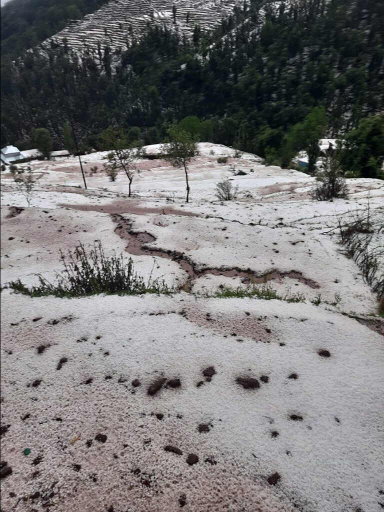 RAJOURI MAY 27 :– For the past several days, normal life has been affected by heavy hailstorm in Pirpunjaal, including Jammu and Kashmir, while on Friday afternoon in Khawas tehsil of Rajouri district of Jammu and Kashmir, vegetables and crops were damaged in a large scale due to heavy hailstorm. After Friday afternoon, other villages of Khawas have been affected by snow-like blanket of hail.