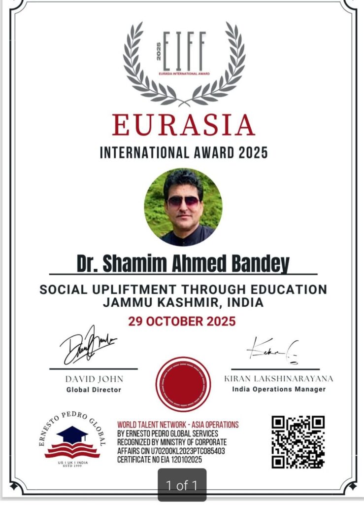 SRINAGAR OCT 30:-In a remarkable recognition of his contribution to education and social welfare, Dr. Shamim Ahmed Bandey from Jammu and Kashmir has been honored with the Eurasia International Award 2025 for “Social Upliftment Through Education.”