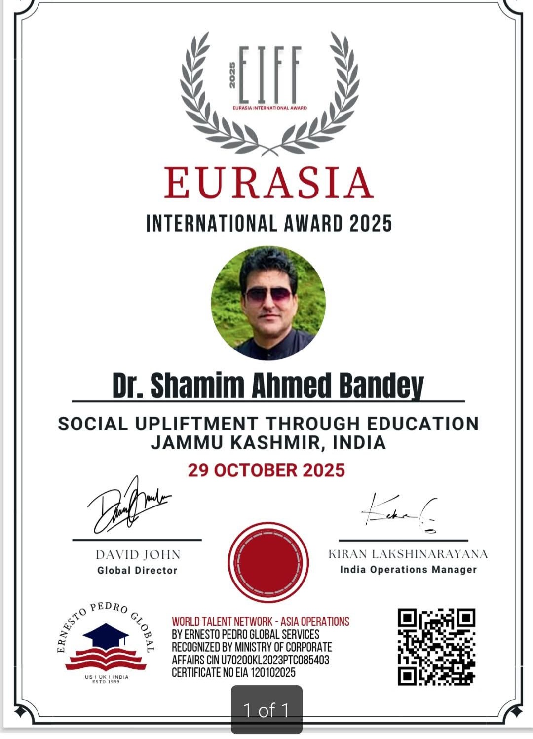 Dr. Shamim Ahmed Bandey Conferred with Eurasia International Award 2025