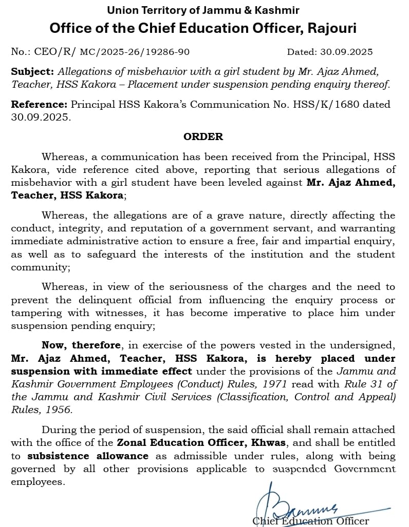 According to the CEO’s suspension order, the school principal had submitted a written report flagging serious allegations of misconduct by teacher Ajaz Ahmad, who also handled admissions. The order noted that the charges were of a “very serious nature, directly affecting the conduct, integrity, and reputation of a government employee.” To ensure a free and fair probe and to safeguard the interests of the institution and students, the teacher was attached to the office of the Zonal Education Officer (ZEO) Khawas, Kotranka subdivision, pending investigation.