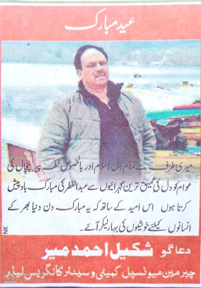 Mendhar. :President Mendhar Youth Association Advocate Tanveer Qureshi has greeted people of the State on the occasion of Eid ul Fitr.