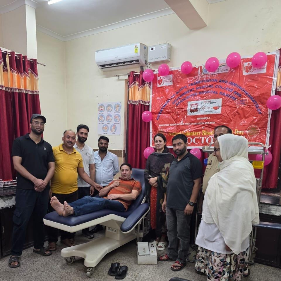 Marking National Blood Donation Day, a blood donation camp was held at Government Medical College (GMC) Rajouri. The event saw participation from medical staff, including Dr. Javed, Deputy Medical Superintendent, along with staff members Showket and Mehroz, who donated blood in the presence of Dr. Iram Choudhary, HoD Blood Bank. The initiative reinforced the message of “Rakht Daan Maha Daan,” spreading the spirit of humanity and service. A similar blood donation camp was also organized by the Municipal Committee Nowshera.